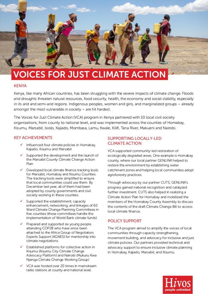 The Voices for Just Climate Action (VCA) program in Kenya partnered with 10 local civil society organizations, from county to national level, and was implemented across the counties of Homabay, Kisumu, Marsabit, Isiolo, Kajiado, Mombasa, Lamu, Kwale, Kilifi, Tana River, Makueni and Nairobi.