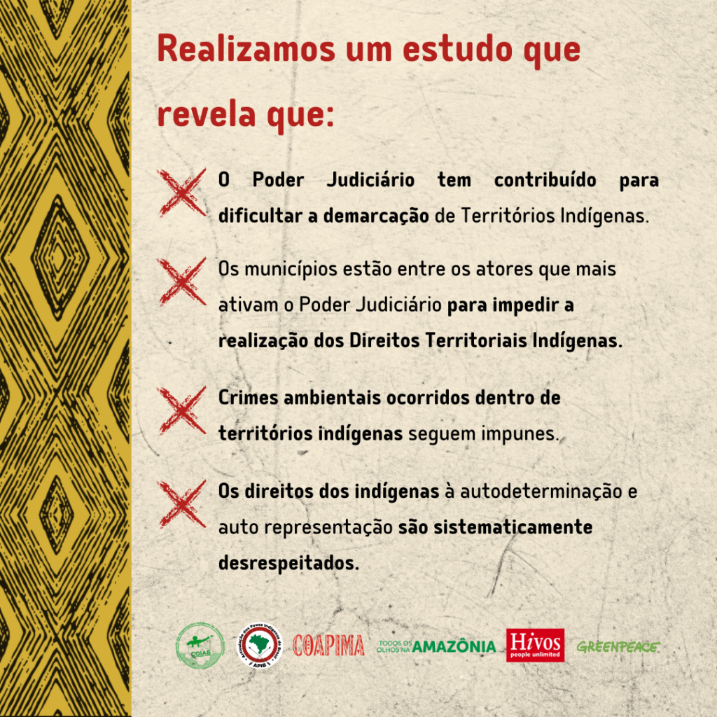 Según el estudio, el poder judicial ha contribuido a obstaculizar la demarcación de territorios indígenas y destaca que los municipios se encuentran entre los actores que más activan al poder judicial para impedir la realización de los derechos territoriales indígenas. El documento también señala que los delitos ambientales que ocurren dentro de los territorios indígenas quedan impunes y los derechos indígenas a la autodeterminación y la autorrepresentación son sistemáticamente irrespetados.