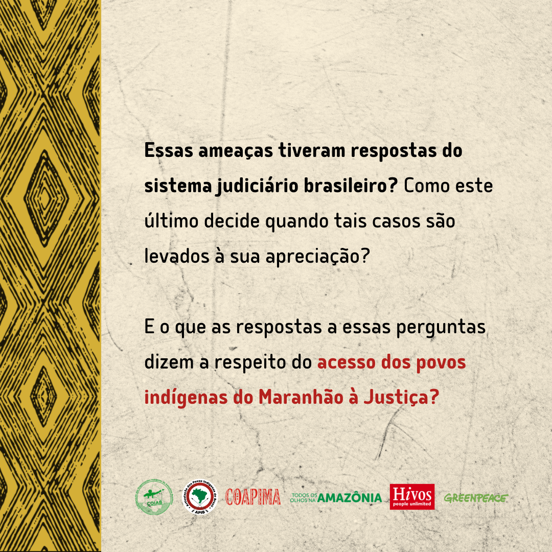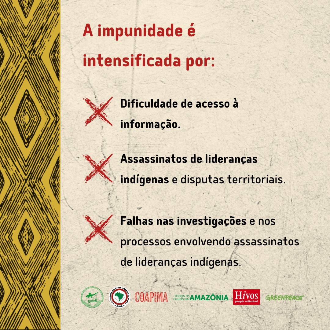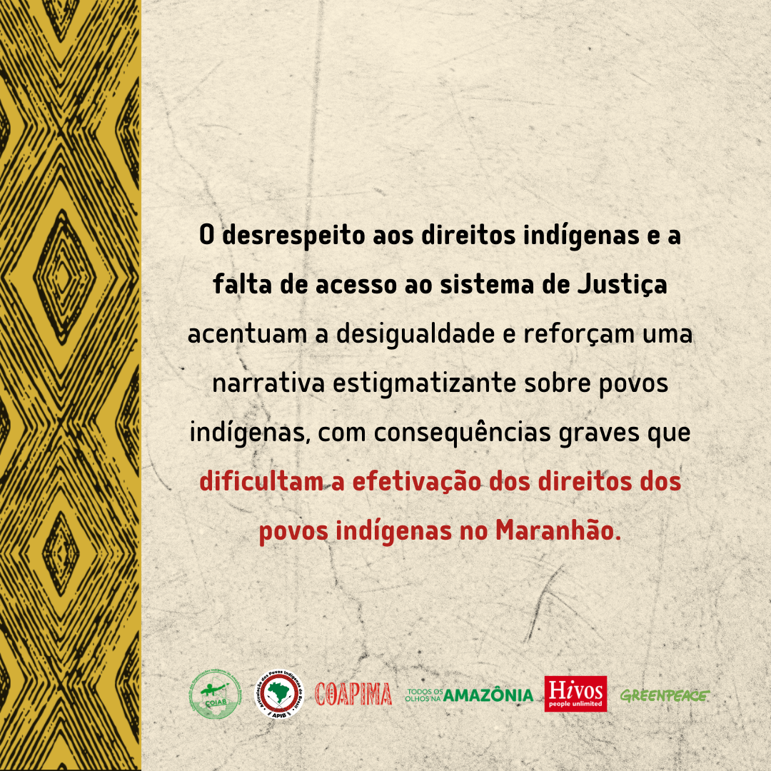 La impunidad se agudiza por la dificultad de acceso a la información, asesinatos de líderes indígenas, disputas territoriales y fallas en las investigaciones y procesos que involucran asesinatos de líderes indígenas. La falta de respeto a los derechos indígenas y la falta de acceso a la justicia acentúan la desigualdad y refuerzan una narrativa estigmatizante, con graves consecuencias para el pleno ejercicio de los derechos de los pueblos indígenas en Maranhão.